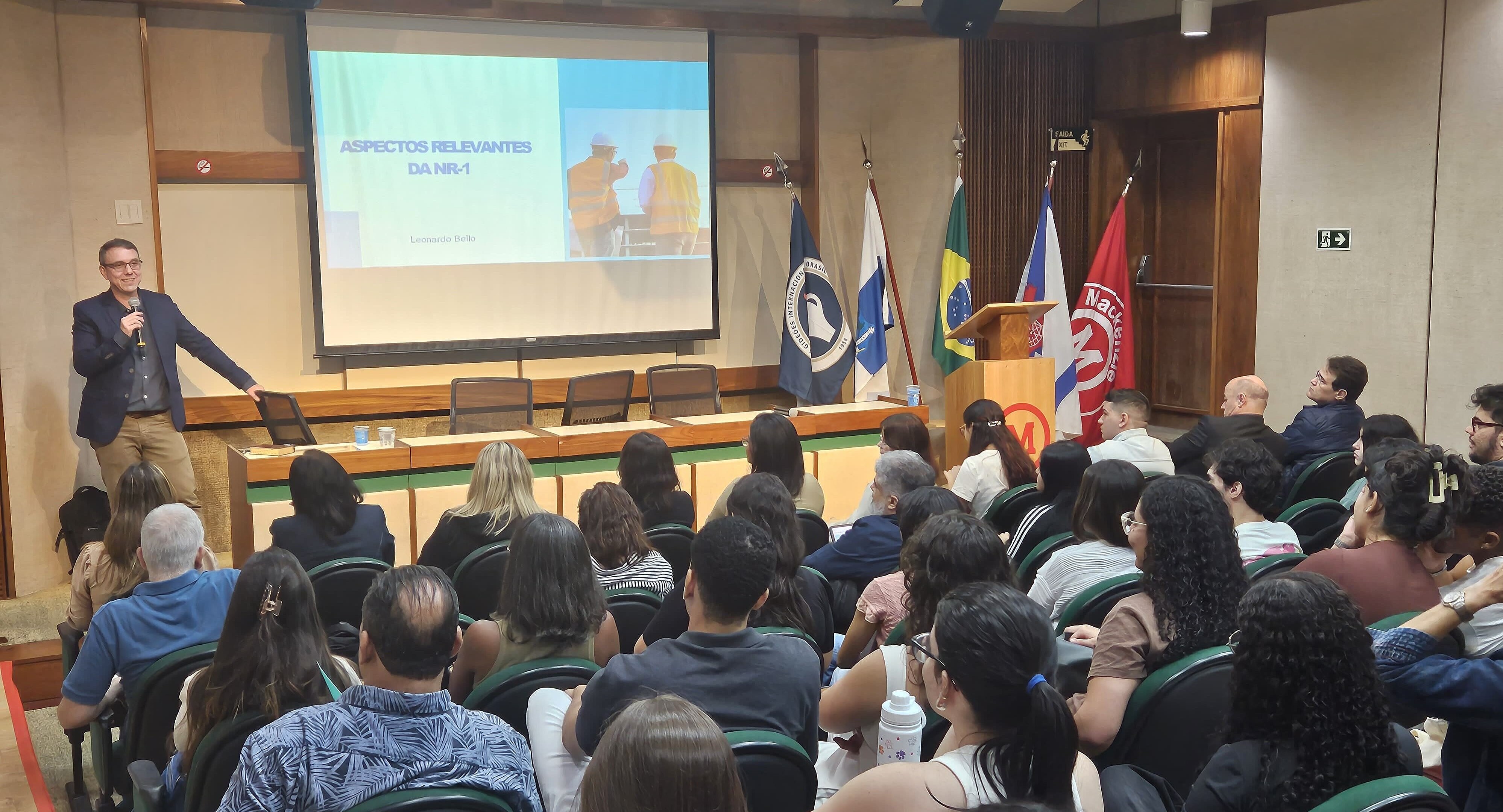 A Faculdade Presbiteriana Mackenzie Rio realizou na última quinta-feira, 22 de maio, um encontro com alunos de Psicologia e Direito para discutir sobre os Aspectos relevantes da NR-01. O palestrante convidado e auditor fiscal do trabalho, Leonardo Bello, falou a respeito da atualização da Norma Regulamentadora NR-1, que estabelece diretrizes gerais para as demais normas de segurança e saúde no trabalho.