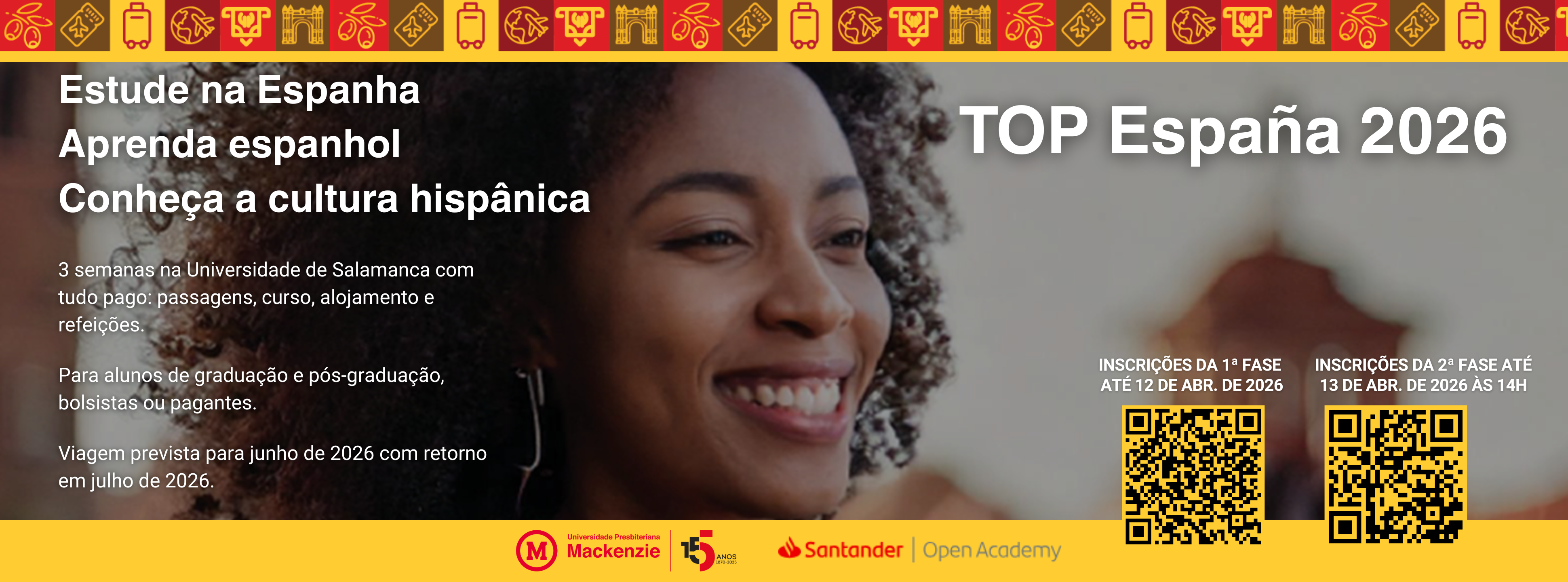 Estudantes da Universidade Presbiteriana Mackenzie (UPM) têm a oportunidade de participar de uma experiência internacional gratuita por meio do programa Santander Top España 2026. A iniciativa é promovida pelo Santander Open Academy, em parceria com a universidade, e concederá duas bolsas de estudo integrais para uma imersão cultural e linguística na Universidad de Salamanca, na Espanha.