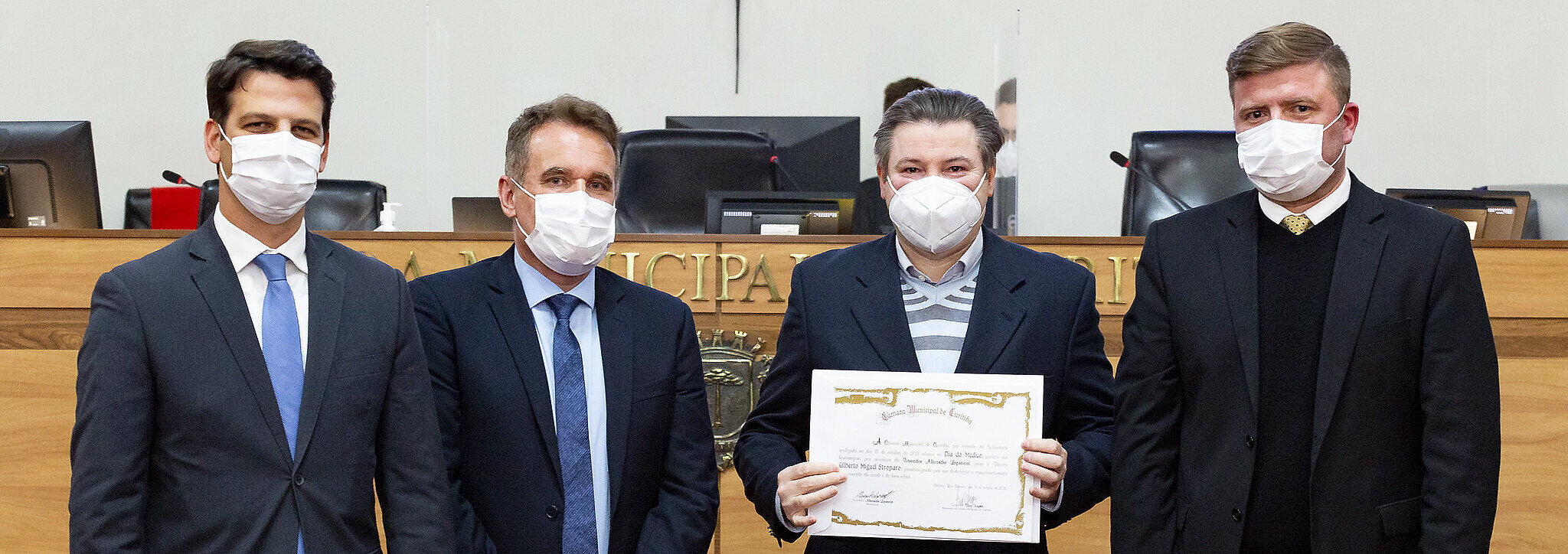 O vice-diretor clínico do Hospital Universitário Evangélico Mackenzie (HUEM), Dr. Gilberto Miguel Stroparo, foi homenageado na Câmara Municipal de Curitiba, nesta segunda-feira, 18 de outubro, em Sessão Solene alusiva ao Dia do Médico, por proposição do vereador e 1º vice-presidente da casa, Alexandre Leprevost.