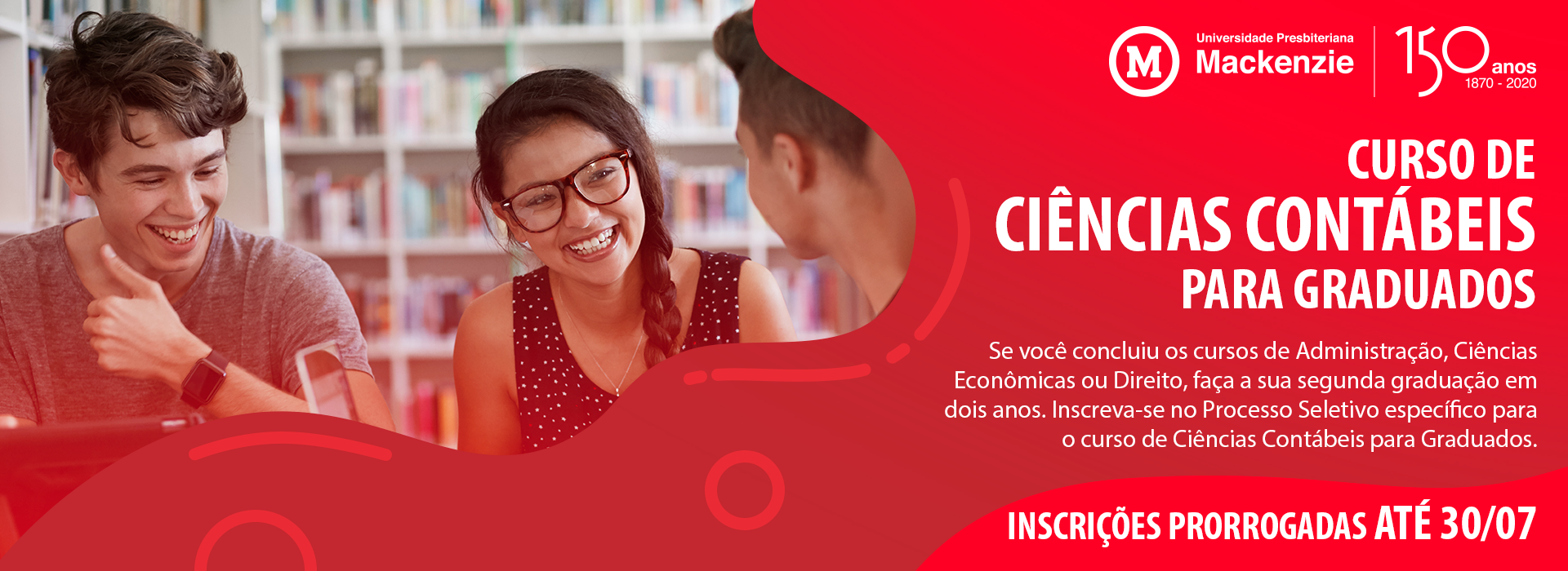 As inscrições para o Processo Seletivo do curso de Ciências Contábeis para Graduados foram prorrogadas até o dia 30 de julho. O curso é oferecido pelo Centro de Ciências Sociais e Aplicadas (CCSA) da Universidade Presbiteriana Mackenzie (UPM), campus Higienópolis. O processo específico é direcionado àqueles que já têm diploma de Administração, Ciências Econômicas ou Direito e pretendem fazer uma segunda graduação, tendo a oportunidade da conclusão em dois anos.