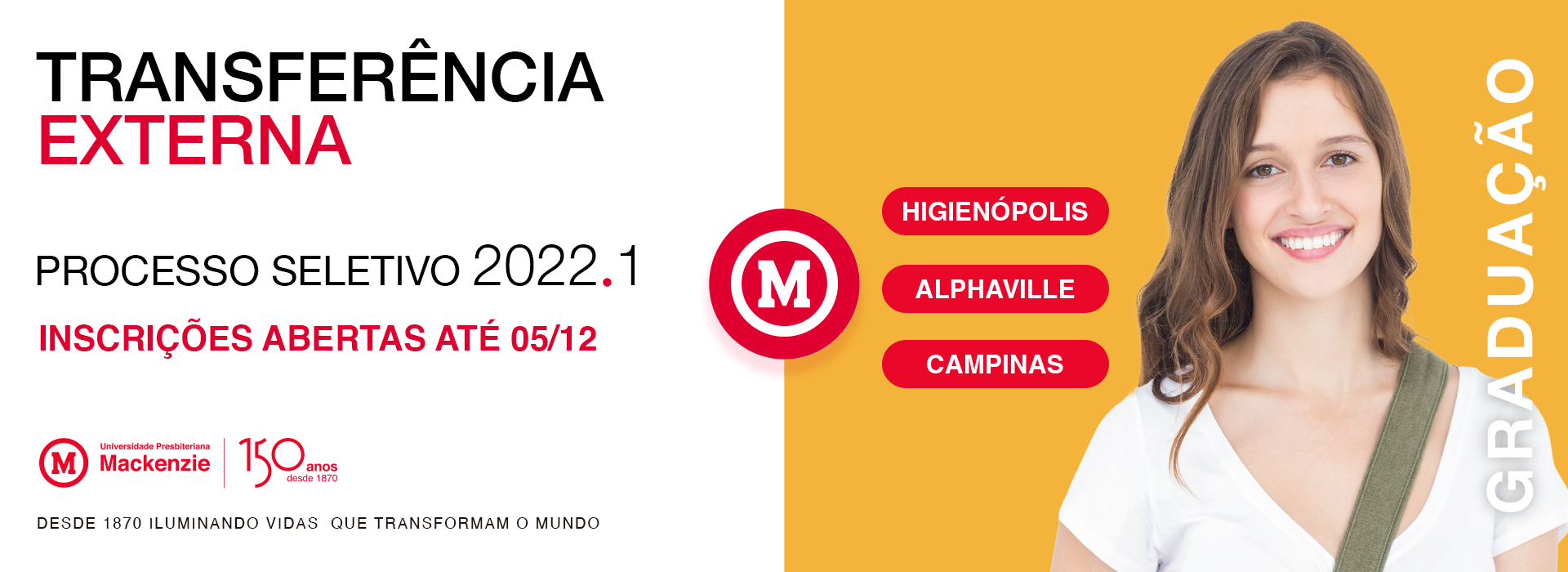 As inscrições para o processo seletivo de Transferência Externa da Universidade Presbiteriana Mackenzie (UPM) foram prorrogadas até 05 de dezembro. As vagas são voltadas para estudantes de outras Instituições de Ensino Superior do país para cursos dos campi Higienópolis, Campinas e Alphaville, entre o segundo e o sétimo semestre.