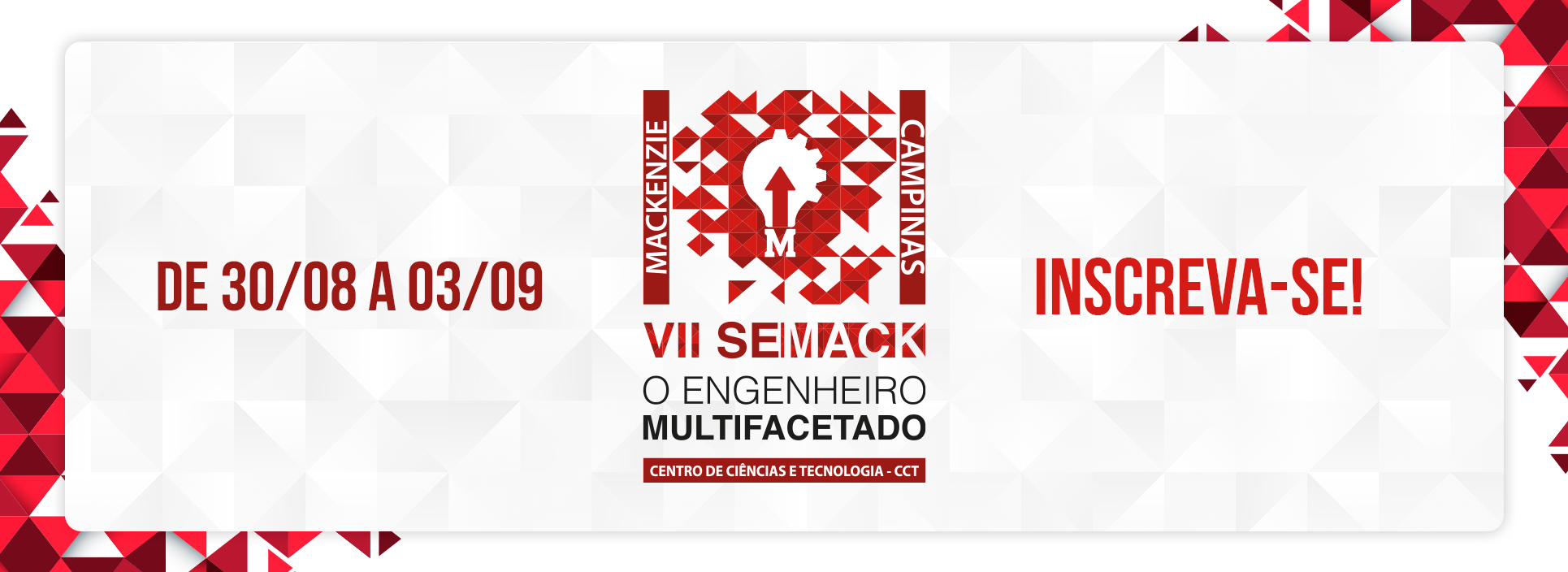 A Universidade Presbiteriana Mackenzie (UPM), campus Campinas, realizará, entre os dias 30 de agosto e 03 de setembro, a sétima edição da Semana de Engenharia (SEMACK), com palestras e mesas redondas realizadas nos turnos diurno e noturno. Neste ano, a discussão será sobre o tema O Engenheiro Multifacetado. O evento será on-line e transmitido pela plataforma Teams, que pode ser acessada neste link.