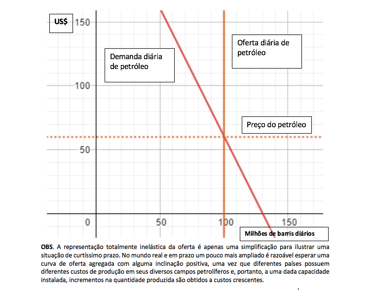 Assumimos que a demanda de petróleo é relativamente inelástica no curto prazo (a exemplo da representação gráfica abaixo). Observamos, ainda, que entre janeiro de 2019 e abril de 2020, o preço médio do barril petróleo do tipo Brent foi de aproximadamente US$60, com a demanda diária de quase 100 milhões de barris, antes do agravamento da crise do coronavírus. A figura abaixo procura representar este equilíbrio. Assim, por simplificação, o faturamento diário dos produtores mundiais de petróleo era de US$6 bi (US$60 por barril X 100 milhões de barris diários).