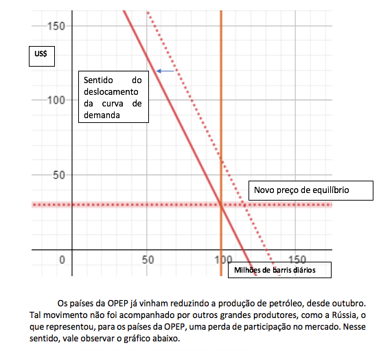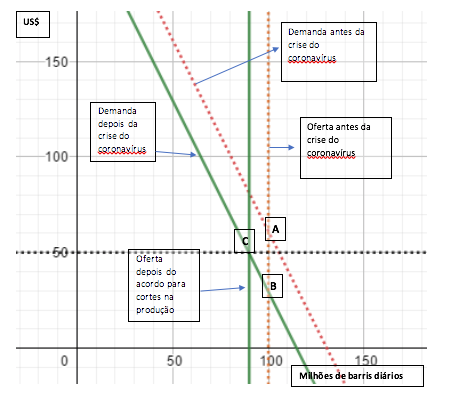 A figura abaixo ilustra, de maneira estilizada, o argumento. Nesse exemplo hipotético, quando o equilíbrio A era dado pelas curvas de oferta e demanda pontilhadas em rosa ao preço de US$60 por barril eram negociados 100 milhões de barris por dia, o que gerava para o conjunto dos produtores um faturamento de US$ 6 bi. Com a redução da demanda (apontada no gráfico, com a nova curva de demanda representada em verde) e mantida a oferta em 100 milhões de barris diários (curva de oferta pontilhada em rosa), o preço cai para aproximadamente US$30 por barril (ponto B, no gráfico), reduzindo o faturamento do conjunto de produtores para US$ 3 bi. Após o acordo para reduzir a oferta para 90 milhões de barris por dia, os preços, no exemplo, se reequilibram em US$50 (ponto C), o que recupera parcialmente o faturamento anterior, chegando ao nível de US$ 4,5 bi.