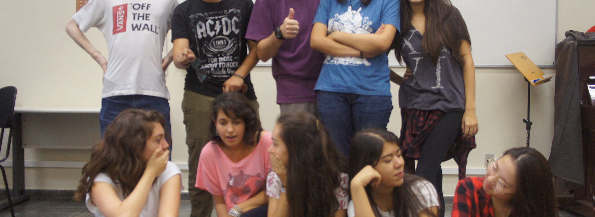 Na sala bege do prédio 48, em frente as quadras do campus Higienópolis, o professor Zedu Neves começa sua aula de teatro. Descontraído, apresenta a nova aluna aos colegas da sala de aula. Sun Diandian, natural da China, conta que entrou para o curso para perder a timidez. Entre uma frase e outra, Zedu brinca: “No teatro fazemos isso. A gente só conversa e perde a timidez”.