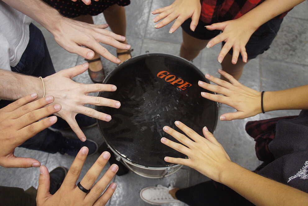 Todos os alunos, inclusive o professor, formaram uma roda de mãos dadas. Os exercícios para a sala relaxar começaram no instante em que Zedu pede a todos para girarem em torno do próprio eixo. A brincadeira tira risada dos alunos que começam a perder o equilíbrio.