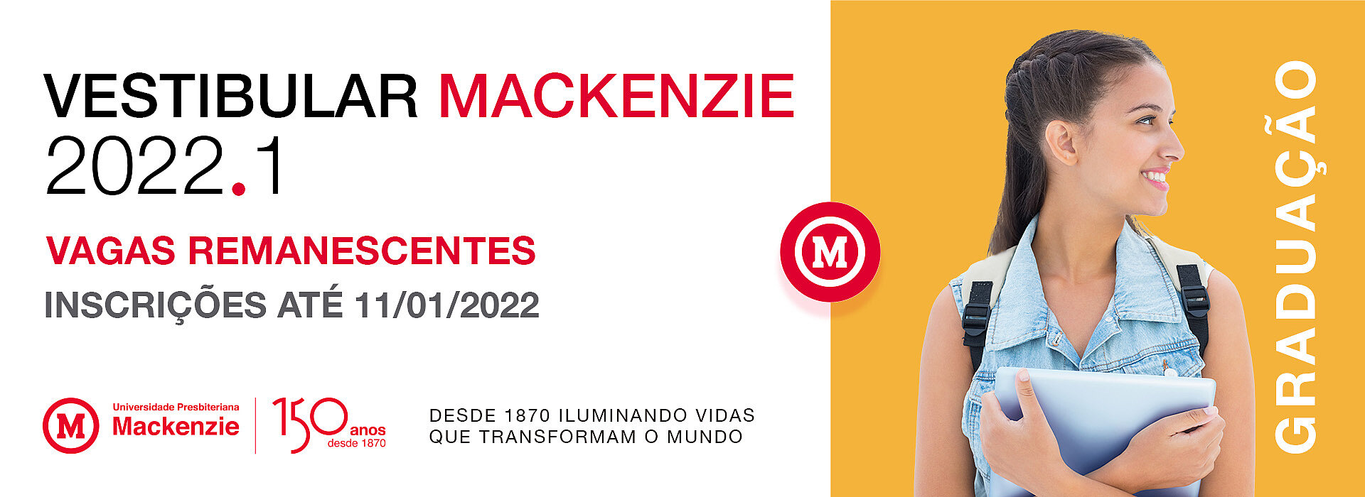 A Universidade Presbiteriana Mackenzie (UPM), campi Higienópolis e Alphaville, está com inscrições abertas para o vestibular de vagas remanescentes dos cursos de graduação para o 1° semestre de 2022. A prova será realizada de forma on-line e o período de inscrições ficará disponível até o dia 11 de janeiro. Para se inscrever, basta acessar os links de Higienópolis e Alphaville.