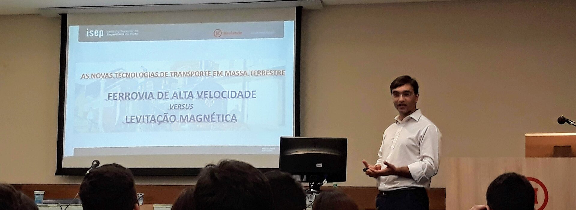 Em visita ao Brasil pela primeira vez, Ângelo Manuel Gonçalves Jacob, professor do Instituto Superior de Engenharia do Porto (ISEP) de Portugal, esteve no Mackenzie, campus Higienópolis, na tarde de 26 de março, para conversar com os alunos de Engenharia da Universidade Presbiteriana Mackenzie e apresentar sua palestra Ferrovia de Alta Velocidade versus Levitação Magnética, baseada em seu trabalho, recentemente apresentado a pesquisadores no congresso mundial MAGLEV 2018, na Rússia, sobre o conceito ProDynamic.