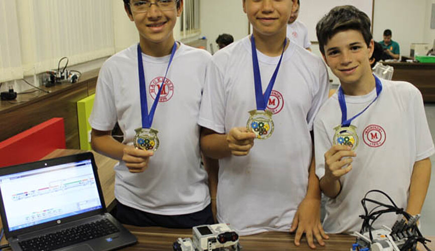 Juliano, Leonardo e Antônio, todos de 12 anos, venceram a etapa regional e agora sonham em conquistar o ouro também no campeonato nacional, o que garantirá vaga para a Olimpíada Mundial de Robótica, que acontecerá em 2017, no Japão.