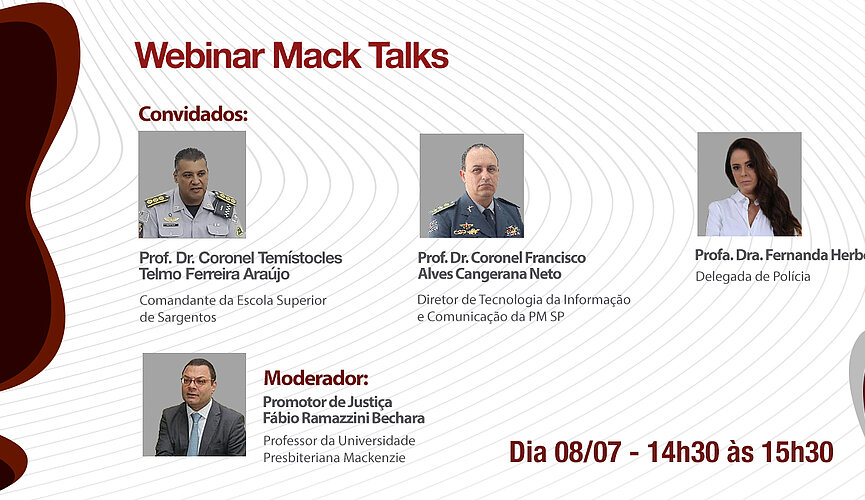 Na quarta-feira, 08 de julho, será realizada a quarta edição do Mack Talks, série de encontros virtuais para debater cenários e tendências do mundo corporativo. Neste novo webinar, o tema discutido será Inteligência e Segurança Pública, com foco nos desafios de investigações e combate à criminalidade. Serão abordados temas como inteligência policial, banco de dados, inovações tecnológicas, atuação integrada entre órgãos, entre outros. O encontro acontecerá às 14h30.
