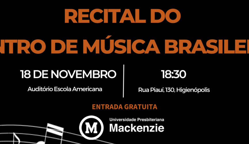 A Universidade Presbiteriana Mackenzie (UPM), por meio da Pró-Reitoria de Extensão e Cultura (PREC) e da Coordenadoria de Arte e Cultura (CAC), promoverá no próximo sábado, 18 de novembro, às 18h30, o Recital do Centro de Música Brasileira (CMB), no auditório Escola Americana, campus Higienópolis.