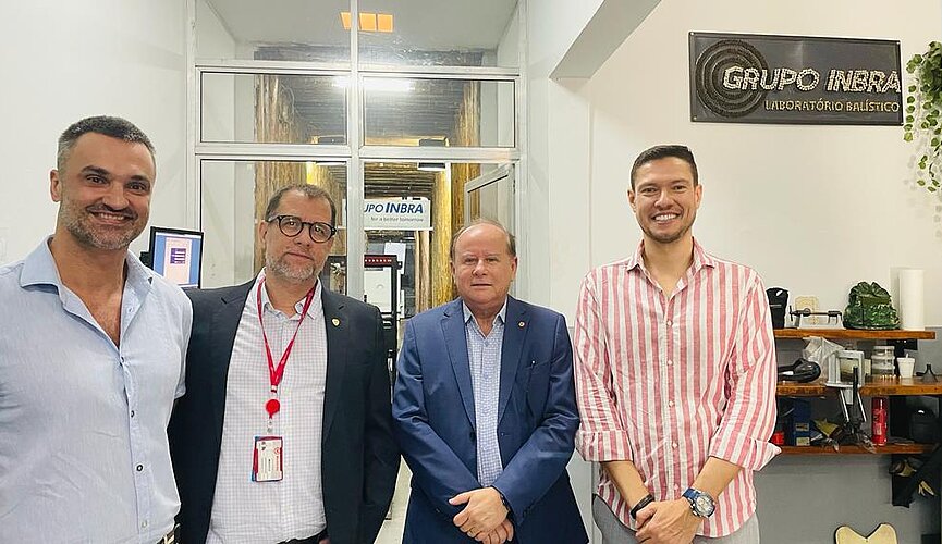O diretor do Instituto Mackenzie de Pesquisa em Grafeno e Nanotecnologia (MackGraphe), Benedito Guimarães Aguiar Neto, e o gerente de projetos, Marcelo Oliveira, visitaram a empresa INBRA, juntamente com os pesquisadores da área de compósitos nanoestruturados multifuncionais, Guilhermino Fechine e Ricardo Andrade.