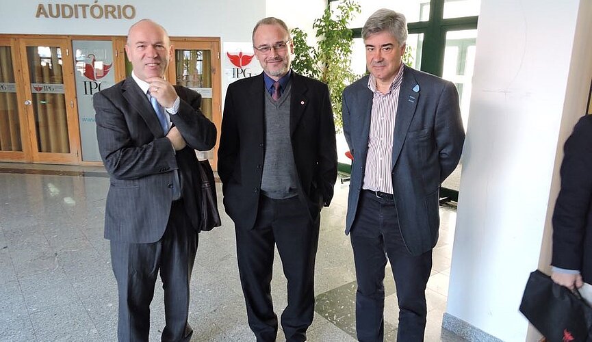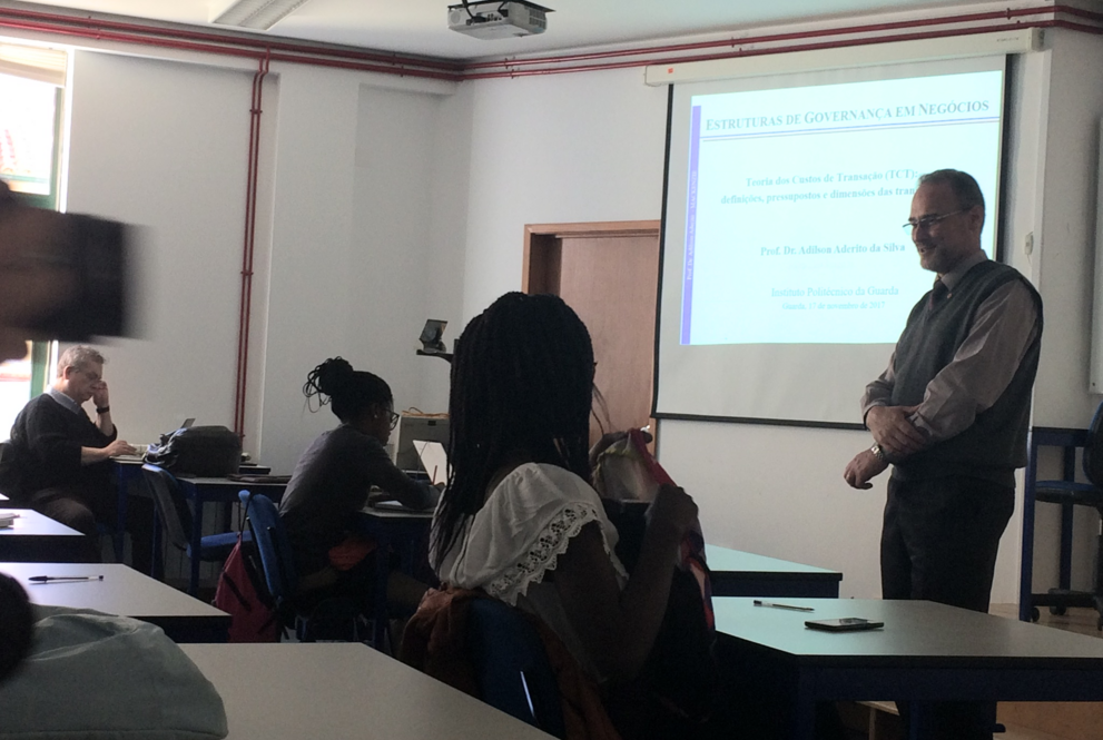 "Entre os sias 12 e 19 de novembro/17, estudantes dos Mestrados profissionais em Administração do Desenvolvimento de Negócios (MPADN), em Controladoria e Finanças Empresariais (MPCONT) e em Economia e Mercados (MPECON), participaram do workshop Novas Fronteiras & Novos Negócios: Uma Aventura na Sustentabilidade em Portugal, organizado pelo Mestrado de Sistemas Integrados de Gestão (Ambiente, Qualidade, Segurança e Responsabilidade Social) e pelo Mestrado de Gestão (Especialização de Contabilidade) do IPG, do Instituto Politécnico da Guarda (IPG) no Município de mesmo nome em Portugal. Participaram do workshop os Mestrandos André Luís Galvão de França, Márcia Regina Barbosa Mota, Raquel Correia da Silva do MPCONT, Cleiton Aparecido dos Santos Abrahão do MPADN e José Luiz de Jesus Cella do MPECON. Foram acompanhados pelo Prof. Dr. Adilson Aderito da Silva, Diretor do CCSA e Professor do MPADN e pelo Prof. Dr. Alberto de Medeiros Jr. Coordenador das APO e Professor do MPADN. O Prof. Adilson Aderito participou de uma banca de Mestrado, como coorientador da candidata Marta Felipa e ministrou aula sobre Custos de Transação para alunos de graduação em Recursos Humanos e em Marketing. As mesmas turmas também assistiram aula do Prof. Alberto sobre Big Data na Auditoria. O workshop foi composto dos seguintes módulos apresentados pelas manhãs em sala de aulas: Análise de investimentos e financiamento de empreendimentos, Economia global e gestão comparada, Empreendedorismo, Gestão da responsabilidade social, Inovação e competitividade"