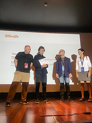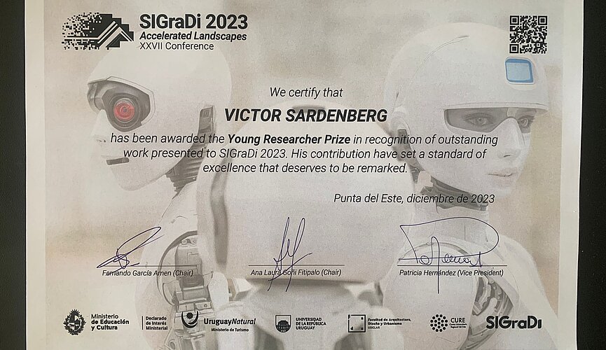 E com enorme alegria que informamos que discente Victor Sardenberg, apresentou o artigo "A walk through the latent space using computational aesthetics as a compass", escrito em conjunto com Mirco Becker e o docente Igor Guatelli e foi honrado com o prêmio de Young Researcher,  o evento foi o SiGraDi em Punta Del Este.
