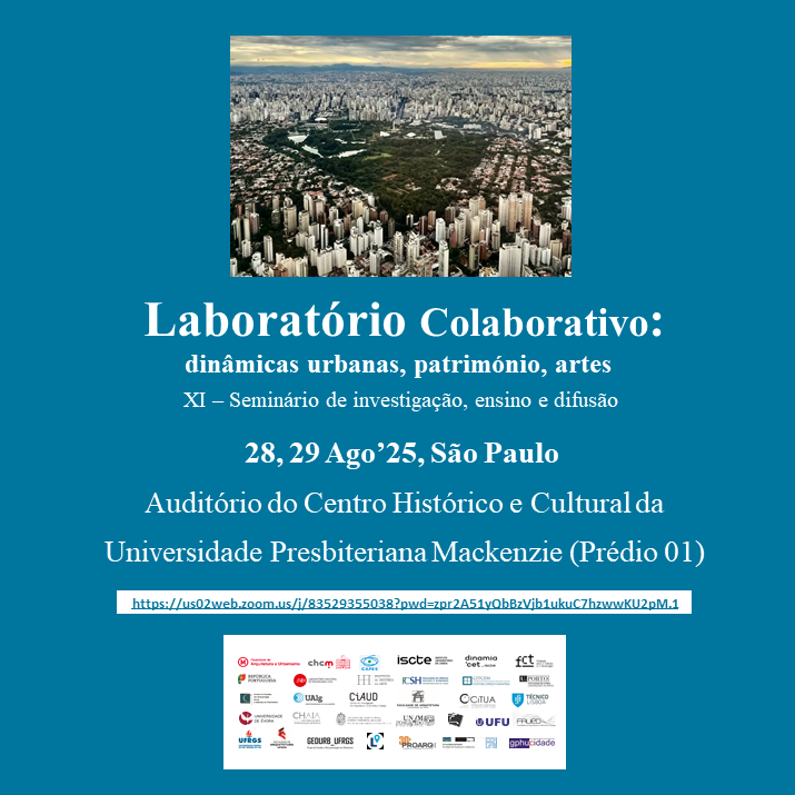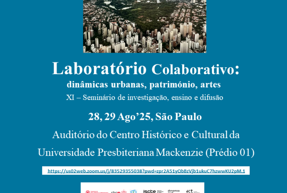 O LABORATÓRIO COLABORATIVO: Dinâmicas Urbanas, Patrimônio, Artes – XI Seminário de Investigação, Ensino e Difusão é uma iniciativa conjunta do Programa de Pós-Graduação em Arquitetura e Urbanismo da Universidade Presbiteriana Mackenzie e do Laboratório do Iscte – Instituto Universitário de Lisboa/Dinâmia’cet-Iscte. O encontro reafirma a importância do diálogo entre grupos de pesquisa das duas instituições de ensino superior, promovendo o aprofundamento e a difusão de investigações em arquitetura e urbanismo, com ênfase nas dinâmicas urbanas, no patrimônio e nas artes.