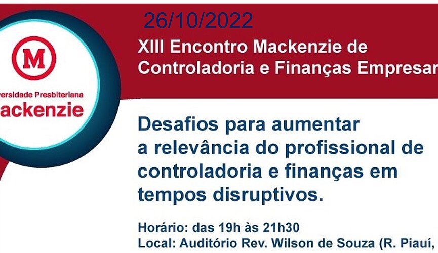 O Programa de Pós-Graduação em Controladoria e Finanças Empresariais realizou no dia 26/10/2022 o 3º dia do XIII Encontro Mackenzie de Controladoria e Finanças, de forma presencial com transmissão ao vivo pelo canal do youtube, com o tema Desafios para aumentar a relevância do profissional de controladoria e finanças em tempos disruptivos.
