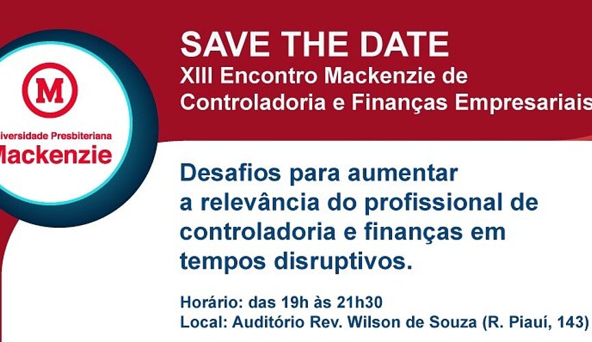 O Programa de Pós-Graduação em Controladoria e Finanças Empresariais tem a honrá de convidá-los a participar do XIII Encontro Mackenzie de Controladoria e Finanças que acontecerá entre os dias 24 e 28 de outubro, de forma presencial, com o tema Desafios para aumentar a relevância do profissional de controladoria e finanças em tempos disruptivos.