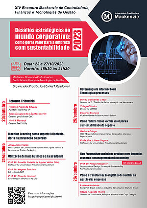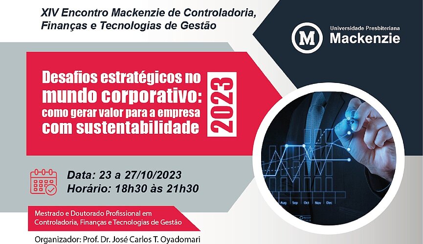 O Programa de Pós-Graduação em Controladoria, Finanças e Tecnologias de Gestão tem a honrá de convidá-los a participar do XIV Encontro Mackenzie de Controladoria, Finanças e Tecnologias de Gestão que acontecerá entre os dias 23 a 27 de outubro, de forma presencial, com o tema Desafios estratégicos no mundo corporativo: como gerar valor para a empresa com sustentabilidade.
