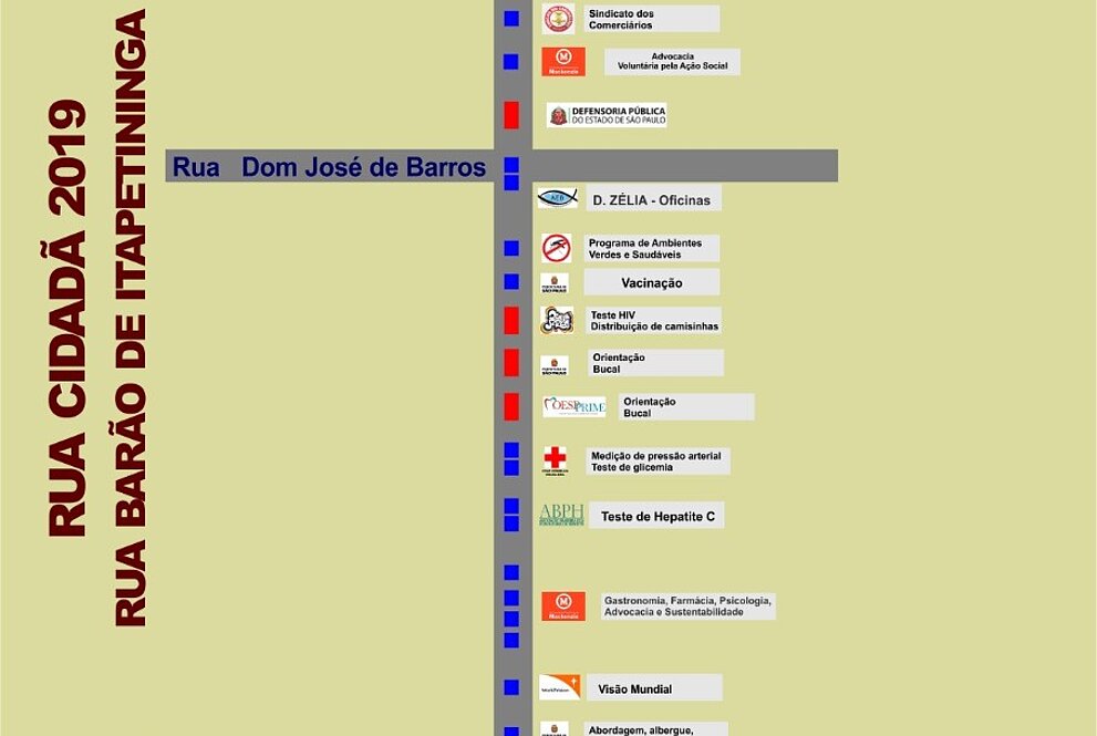 O Mackenzie Voluntário contribuirá na Rua Cidadã Barão Itapetininga como parceiro do comitê organizador, ajudando na divulgação e na logística, além de colaborar com a iniciativa com serviços oferecidos por alunos voluntários, principalmente dos cursos de Direito e Farmácia - com a oferta de orientações jurídicas e testes na área de saúde, como glicemia, aferição de pressão, etc.