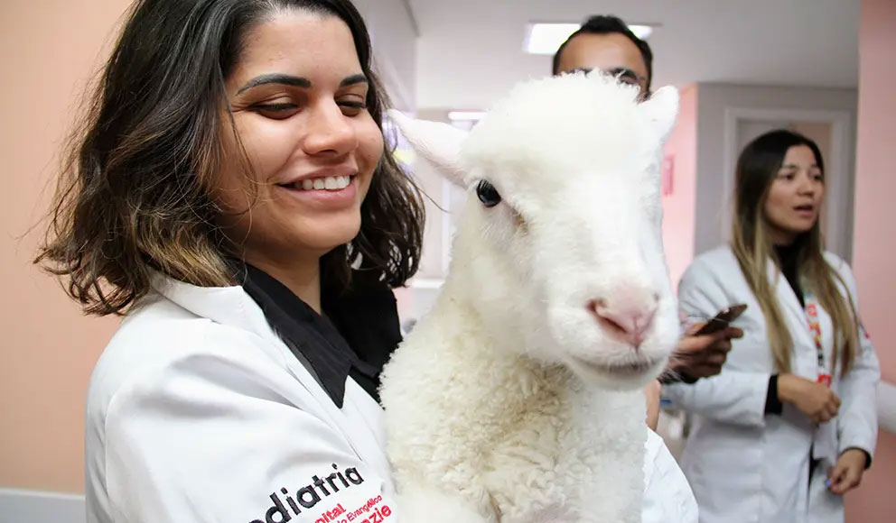 O dia 25 de agosto ficou marcado por uma iniciativa pioneira no Hospital Universitário Evangélico Mackenzie (HUEM). Em vez das costumeiras visitas mensais de cães e gatos, as crianças da ala pediátrica tiveram uma surpresa com o projeto Amigo Bicho: a presença de três ovelhas nos corredores do hospital. Os pequenos pacientes, suas famílias e a equipe hospitalar foram tomados por um verdadeiro encantamento. A terapia assistida por animais proporciona experiências diferenciadas no âmbito hospitalar, o que favorece o tratamento das crianças, como explica o pediatra e diretor técnico do HUEM, Dr. Gilberto Pascolat. O objetivo das visitas é incentivar a socialização entre profissionais da saúde, pacientes e familiares, por meio do contato com animais dóceis e que tenham boa convivência com humanos. A Terapia Assistida por Animais auxilia na redução da ansiedade e do estresse e possibilita maior motivação, uma vez que a interação humana com animais libera dopamina — neurotransmissor responsável pela sensação de prazer e felicidade.