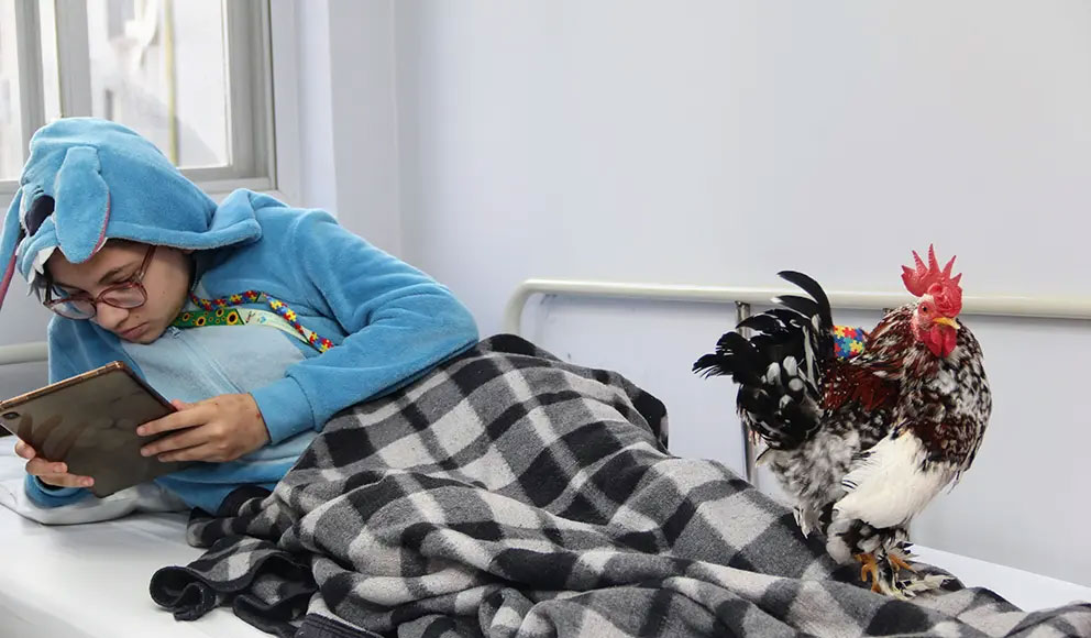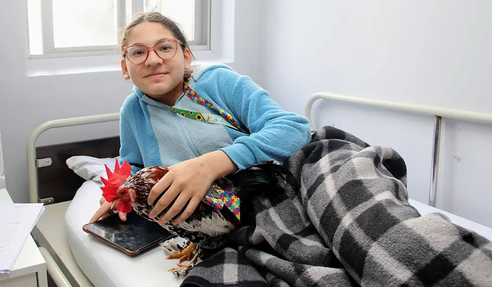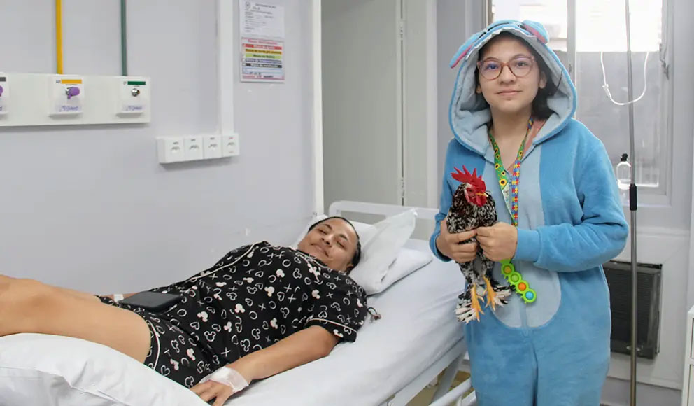 Recentemente, a equipe de profissionais do HUEM presenciou uma cena incomum, mas que mexeu positivamente com o ambiente hospitalar. A paciente Aymee Sophie, 12 anos, foi autorizada a ter, durante o tratamento, a companhia de seu galo Paçoca, o animal de suporte emocional da menina. Diagnosticada com transtorno do espectro autista, acompanhado de comorbidades, incluindo epilepsia e hiperlexia, Aymee esteve também acompanhada de sua mãe, Janete Soares de Almeida. As duas são naturais de Cascavel, no oeste do Paraná. Elas viajaram para Curitiba para que Janete pudesse realizar uma cirurgia de redução de mama em razão do gigantismo mamário que a afligia. O vínculo entre Aymee e o galo começou dois anos atrás. O animal deixa a menina segura e menos ansiosa. Janete estava apreensiva quanto à possibilidade de trazer Paçoca, mas no HUEM encontrou uma recepção que superou suas expectativas. O Hospital demonstra assim que o cuidado vai além da medicina e engloba o bem-estar emocional e o conforto dos pacientes e de suas famílias.