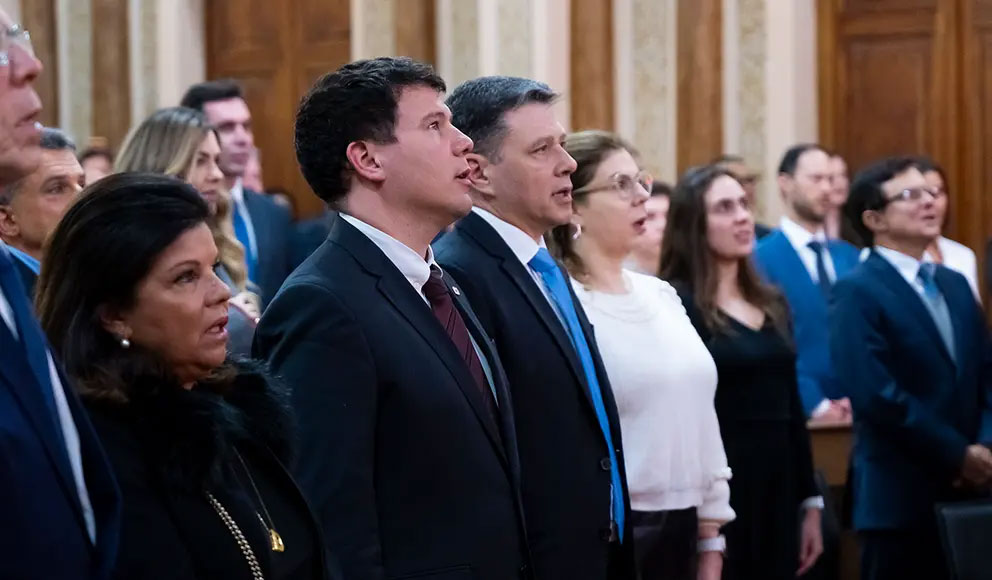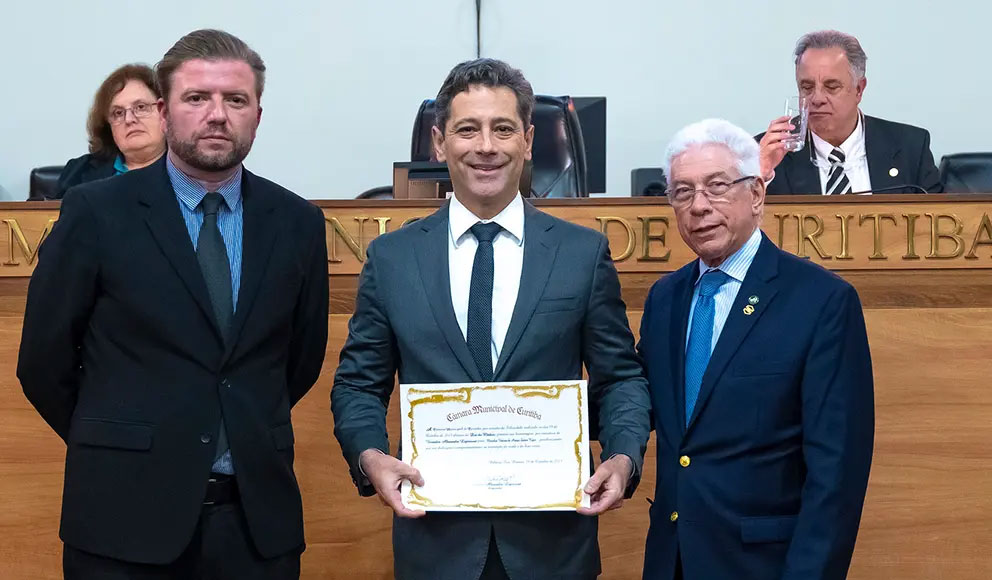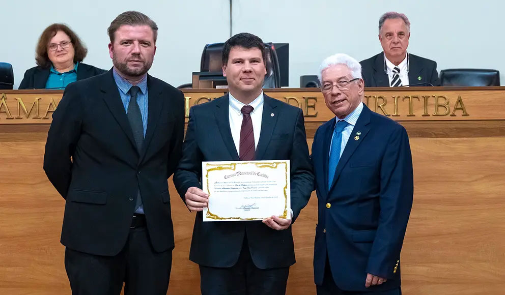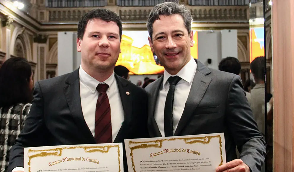 Dois médicos do HUEM foram homenageados pela Câmara Municipal de Curitiba, em sessão solene alusiva ao Dia do Médico, 18 de outubro. O diretor-geral, Dr. Tiago Tormen, e o chefe do setor de Queimados, Dr. Marcelus Nigro, receberam um certificado referente aos relevantes serviços prestados à sociedade. O evento aconteceu no Palácio Rio Branco, sede do Legislativo da capital paranaense, por proposição do vereador Alexandre Leprevost. Diversas autoridades participaram da cerimônia, que homenageou ao todo 86 profissionais de diferentes especialidades médicas. A secretária municipal de Saúde, Beatriz Batistella Nadas, destacou o trabalho realizado na capital do Paraná e agradeceu nominalmente o diretor-geral do HUEM pela parceria do Hospital com a Prefeitura de Curitiba, no atendimento a pacientes pelo Sistema Único de Saúde (SUS).