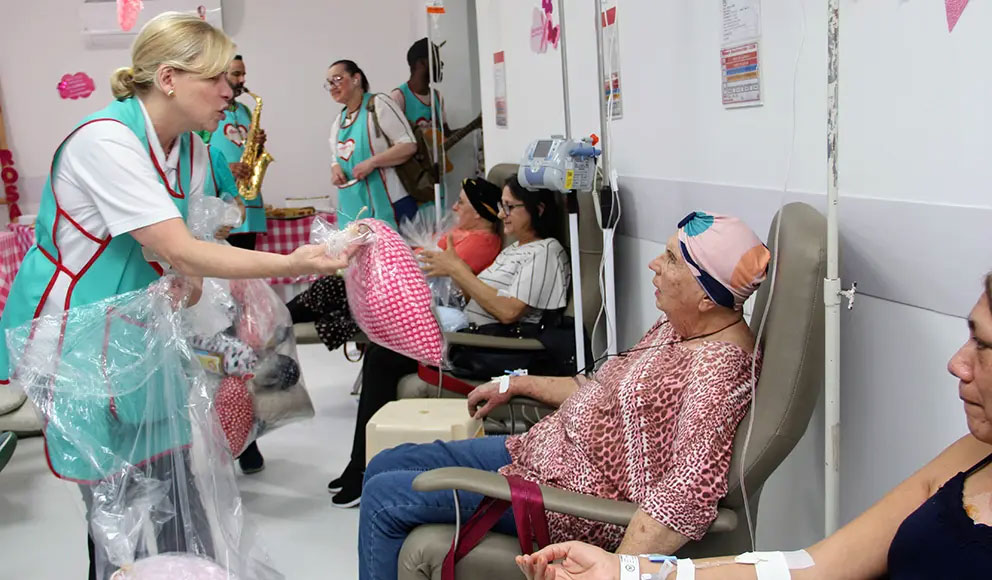 Durante o dia, as pacientes receberam uma almofada em forma de coração e um café da tarde completo, com salgados, bolos, doces e sucos — cortesia do grupo Atitude do Coração, da Igreja Batista da Alameda, que também levou músicos para entoarem belos hinos e louvores.