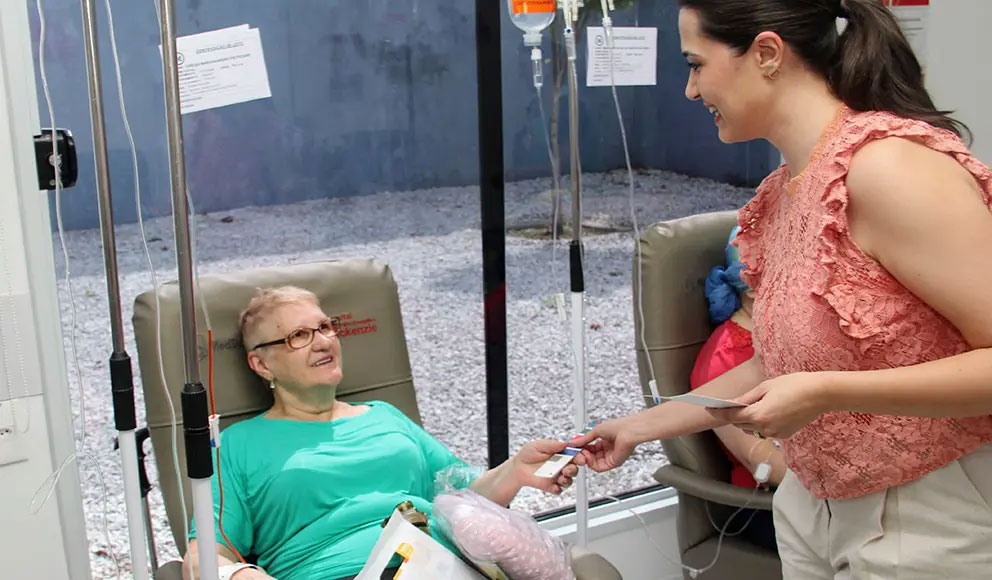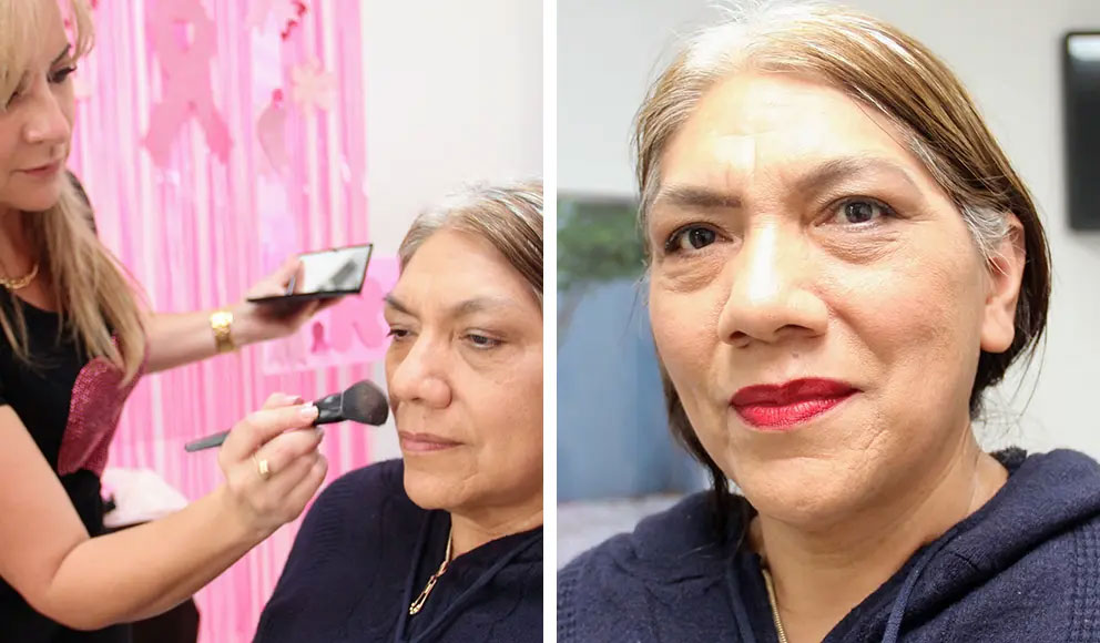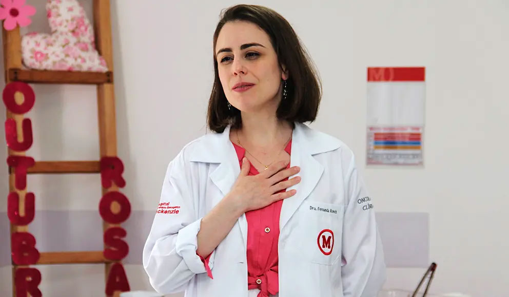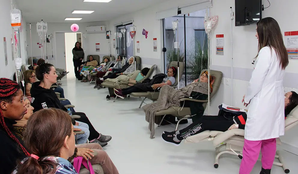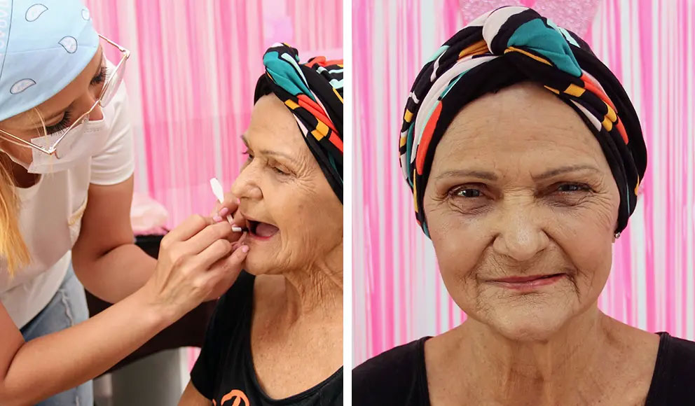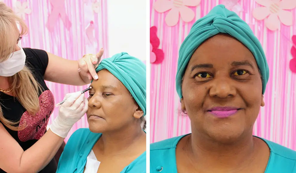 A consultora de imagem Ana Paula Carneiro deu uma palestra para cerca de vinte pacientes presentes na sala de infusão do Centro de Oncologia Mackenzie (COM), na qual abordou o poder das cores para que não se sintam apagadas nesse momento da vida. Ela destacou que é um bom momento para testar coisas novas, como chapéus e armações de óculos diferentes, mais coloridas. Em seguida, distribuiu para as participantes cartões com as cores universais e como harmonizá-las. Por sua vez, a maquiadora profissional Edna Oliveira atendeu as pacientes interessadas em embelezar os rostos, de acordo com a característica de cada uma.