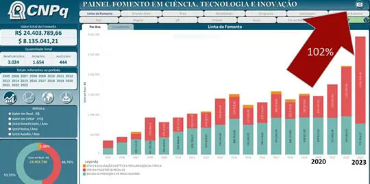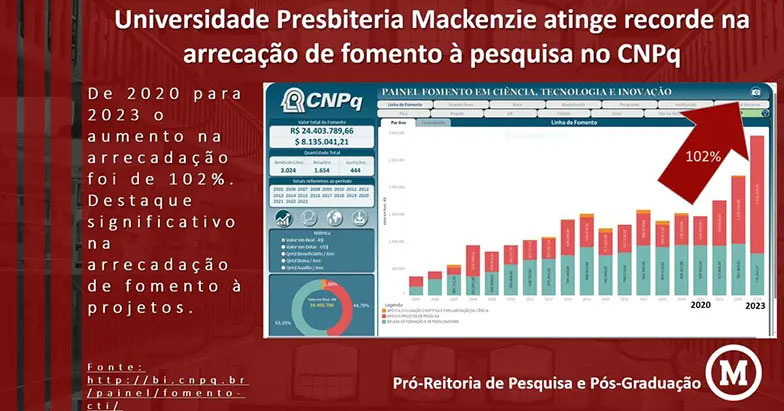 A UPM registrou um aumento nas verbas recebidas do Conselho Nacional de Desenvolvimento Científico e Tecnológico (CNPq). Desde 2020, a Instituição teve um crescimento na captação de recursos de 102%. Em 2023, a UPM recebeu R$ 3,25 milhões. A maioria dos recursos é destinada a apoios de projeto de pesquisa (R$ 2,37 milhões) e a bolsas de formação de pesquisadores (R$ 881 mil), com boa parte desses recursos voltada para o Programa Institucional de Bolsas de Iniciação Científica (Pibic/CNPq). Diante desse cenário, a UPM garantiu um aumento de 25% nos recursos que serão recebidos até 2025. Os principais fatores que impactaram na concessão do aumento do fomento à pesquisa foram projetos de pesquisa, quantidades de pesquisadores e pesquisadoras com bolsa produtividade, análise do processo do Pibic e o acompanhamento de egressos e egressas. O fomento por meio do CNPq vai garantir maior número de bolsas de iniciação científica, o que impactará diretamente os estudantes da UPM. Professores e pesquisadores também colherão os benefícios, pois poderão ter mais recursos para os estudos.