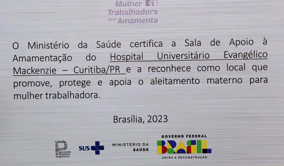 Em 10 de novembro, o HUEM recebeu do Ministério da Saúde a certificação da Sala de Apoio à Mulher Trabalhadora que amamenta. O certificado reconhece o Hospital como um local que promove, protege e apoia o aleitamento materno. A placa foi entregue por meio da assessora técnica da Coordenação de Atenção à Saúde da Criança e do Adolescente, Renara Guedes Araújo.