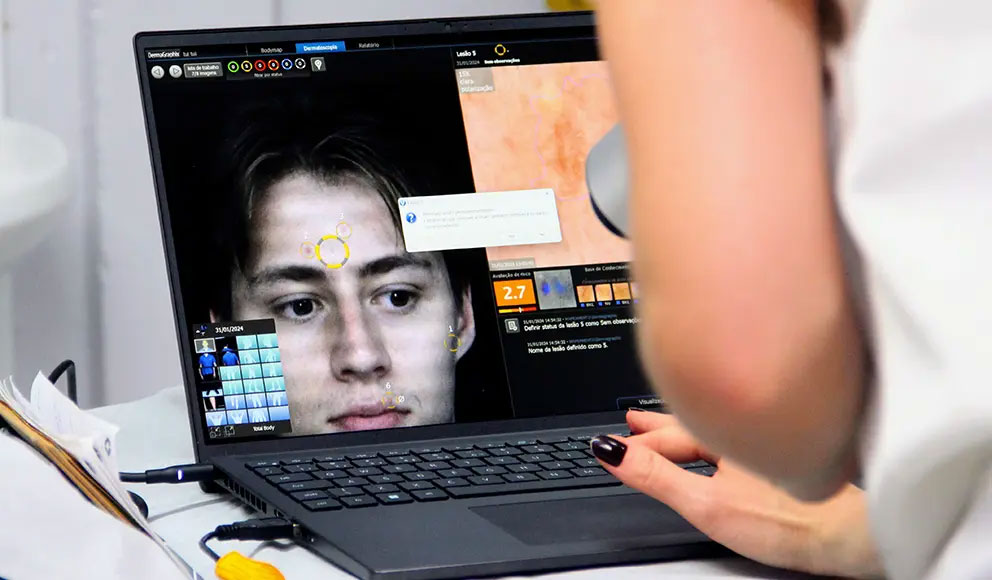 Além de facilitar o acompanhamento das pintas da pele, o equipamento consegue registrar e armazenar essas informações para detectar com precisão futuras alterações, como esclarece o coordenador da unidade de Dermatologia e Cosmiatria do HUEM, Dr. Lincoln Fabrício. “O equipamento aumenta significativamente a imagem da lesão e registra as características dermatoscópicas de cada pinta. Um ano depois, conseguiremos saber exatamente se apareceu uma pinta nova ou se houve alteração em pinta já mapeada”, afirma.