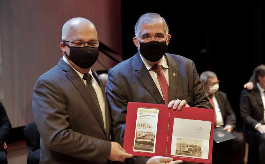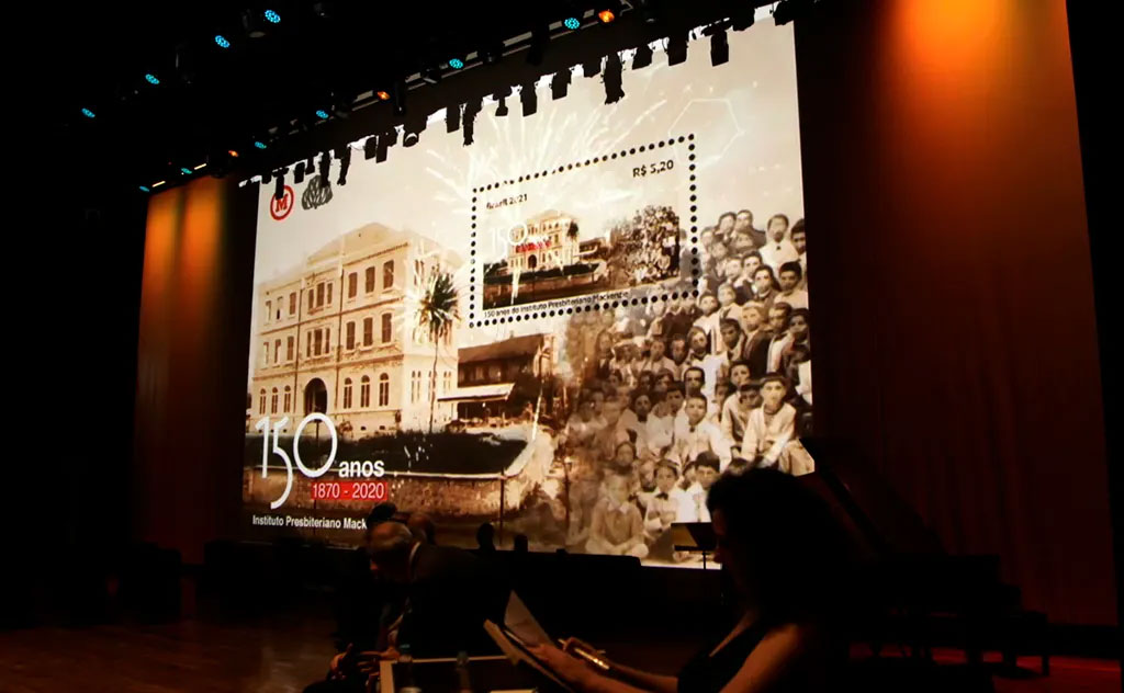 Entre os diferentes materiais lançados para celebrar o sesquicentenário do Mackenzie, o destaque vai para a peça postal, cuja cerimônia de obliteração, realizada em 15 de outubro, no Auditório Ruy Barbosa, contou com a presença de representantes da Instituição e da presidência dos Correios.