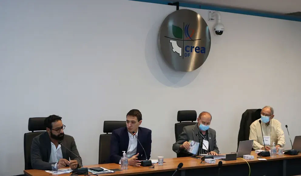 A partir da esq., Bruno Almeida, coordenador geral do Túnel de Taguatinga; professor Vinícius Resende; José Silvino de Carvalho, presidente do SENGE DF; José de Fátima da Silva, diretor do SENGE DF.