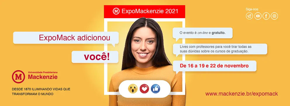 A ExpoMackenzie 2021 On-line, realizada de 16 a 22 de novembro, teve o objetivo de apresentar a UPM aos futuros mackenzistas. Foram três lives apresentadas pelo Centro de Ciências Biológicas e da Saúde (CCBS), pelo Centro de Comunicação e Letras (CCL) e pelo Centro de Ciências Sociais e Aplicadas (CCSA). Em palestras, os coordenadores e professores apresentaram os cursos de cada uma das unidades acadêmicas, destacando conteúdos, atividades, estrutura e tudo o mais que só o Mackenzie oferece. Confira as lives de Administração e Comércio Exterior, do Centro de Ciências Biológicas e da Saúde e de Publicidade.