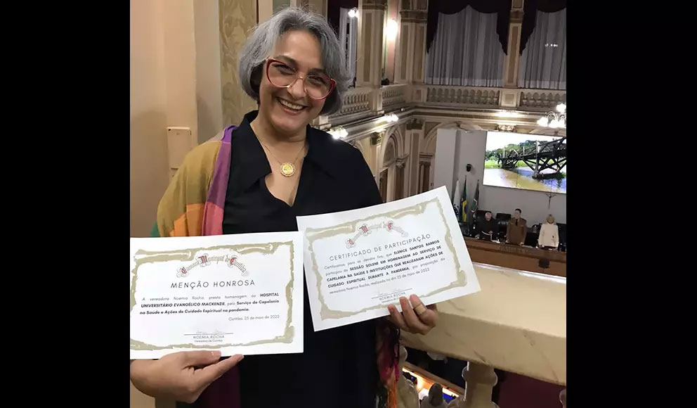 O serviço da Capelania de Saúde do Hospital Universitário Evangélico Mackenzie recebeu menção honrosa da Câmara Municipal de Curitiba em razão dos trabalhos de excelência prestados durante a pandemia de covid-19, por meio de ações de cuidados emocionais e espirituais para pacientes e seus familiares, equipes clínicas e colaboradores do HUEM. O evento aconteceu no Palácio Rio Branco e estiveram presentes o capelão, rev. Hilário Batista, e a assistente de capelania hospitalar do Mackenzie, Elenice Santos Barros.