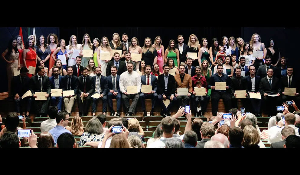 Em 25 de fevereiro, foi realizada, no auditório da Associação Médica do Paraná, a cerimônia de formatura dos 94 integrantes do programa de residência médica e especialização no HUEM pela Fempar. Formandos de 32 diferentes especialidades receberam o certificado de conclusão de curso. O diretor-geral do HUEM, dr. Tiago Hessel Tormen, fez parte da mesa diretiva do evento e saudou os novos profissionais. “A missão do Mackenzie é educar e cuidar. E nosso programa de residência médica e especialização representa bem essa missão, pois educa cuidando. Nós, como Instituição, queremos parabenizar vocês por tudo o que fizeram. Se o hospital prestou mais de um 1,7 milhão de atendimentos no ano passado, também é graças à atuação de vocês”, destacou Tormen.