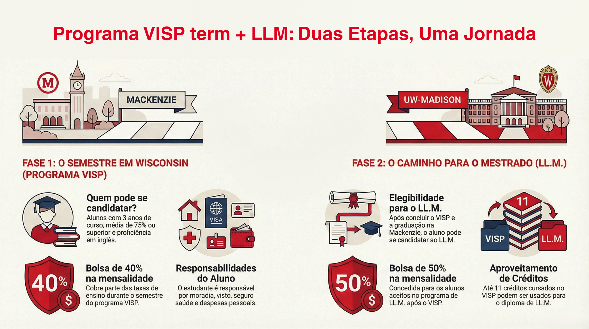 O acordo de parceria entre a Faculdade de Direito da UPM e a University of Wisconsin–Madison Law School (UW–Madison) possibilita que os alunos participem do programa VISP Term+ LL.M.: após completarem três anos no Mackenzie, os estudantes podem ser indicados para cursar um semestre (outono ou primavera) na UW-Madison como alunos visitantes internacionais (VISP). Os créditos obtidos durante esse intercâmbio podem ser aproveitados na graduação brasileira e, caso o aluno seja posteriormente admitido no mestrado, até 11 créditos cursados podem ser utilizados para o cumprimento dos requisitos do diploma de Master of Laws (LL.M.) da UW-Madison.