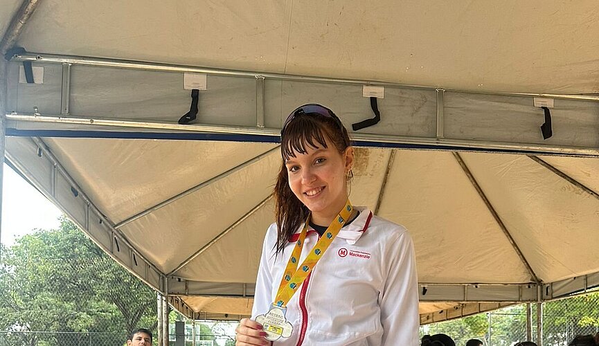 Aluna do curso de Direito da Faculdade Presbiteriana Mackenzie Rio e sul-mato-grossense, Bruna Brandt brilhou nas areias apesar da intensa rotina de estudos. Com uma trajetória marcada por dedicação e disciplina, adquirida pela prática esportiva, a jovem atleta concilia os treinos com a graduação e, às vésperas das provas finais do primeiro semestre de 2025, levou o material para estudar durante a viagem, para que os jogos não interferissem no resultado acadêmico.