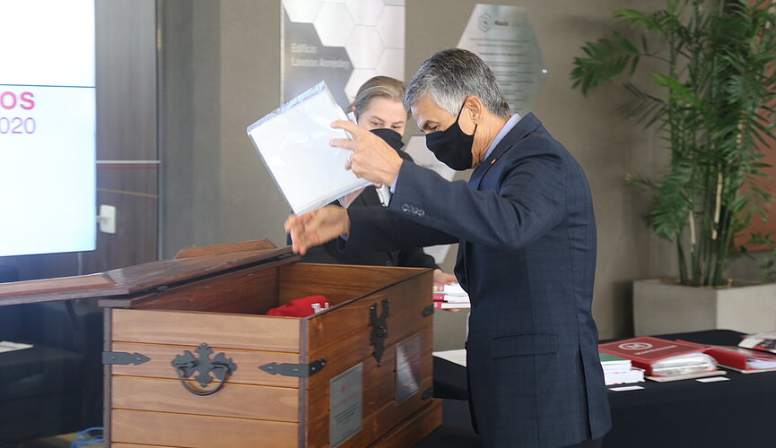 O manual de combate à covid-19 e uma máscara com o logo do Mackenzie foram depositados no baú pelo presidente do Instituto Presbiteriano Mackenzie (IPM), José Inácio Ramos, que elogiou a iniciativa do Baú da Memória Mackenzista e parabenizou a todos os participantes. “Essa é uma cerimônia muito relevante e significativa. Estamos aqui com um ar de saudosismo”, enfatizou.