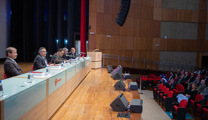 Após as falas institucionais, a mesa da conferência foi composta, além do conselheiro Freitas e do professor Amaral, pelo: professor emérito da UPM, Ives Granda Martins; presidente do Conselho da Administração do Bradesco, Luiz Carlos Trabuco; e o próprio Troyjo.