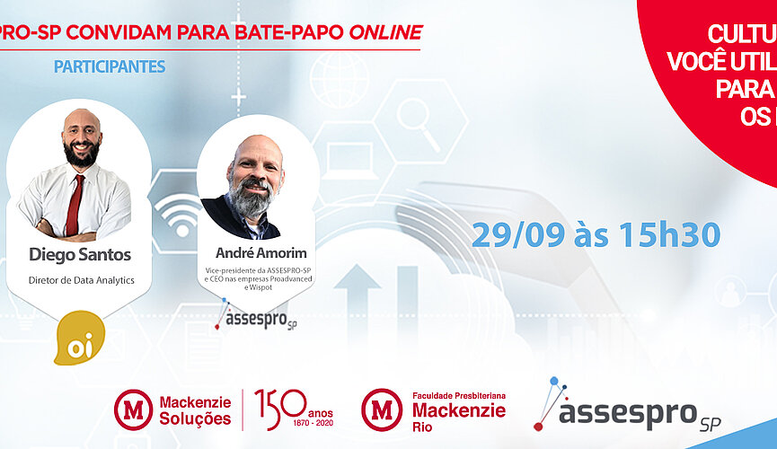 Entre os tópicos que serão discutidos nesta quinta-feira estão: tecnologia, inovação, literacia de Dados, cultura data driven, decisão baseada em dados e mudança de mindset. A palestra contará com a presença do diretor de Data Analytics da Oi, Sergio Gaiotto; do vice-presidente da ASSESPRO-SP e sócio/diretor das empresas Wispot e Proadvanced, Waldemar Lobo; e do coordenador geral da Pós-Graduação Mackenzie Rio, professor Fernando de Oliveira Santoro.