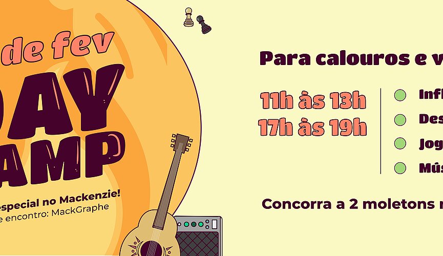 Como parte da programação da Recepção aos Calouros 2024.1, na próxima semana, será realizado, no dia 08 de fevereiro, o Day Camp, organizado pela Chancelaria do Mackenzie com o apoio da Universidade Presbiteriana Mackenzie (UPM), por meio da Coordenadoria de Desenvolvimento Discente e de Carreiras (CDD), da Pró-Reitoria de Graduação (PRGA). Neste dia, calouros e veteranos participarão de atividades esportivas em uma competição entre as unidades acadêmicas. Haverá também brinquedos infláveis, jogos interativos e muita música.