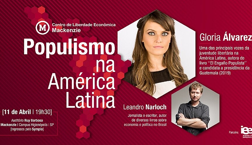 No próximo dia 11 de abril, o auditório Ruy Barbosa do Mackenzie, campus Higienópolis, receberá a cientista política e conferencista internacional, Gloria Álvarez, e o jornalista Leandro Narloch para uma conferência sobre o Populismo na América Latina. O evento, organizado pelo Centro Mackenzie de Liberdade Econômica (CMLE) do Centro de Ciências Sociais e Aplicadas (CCSA) da Universidade Presbiteriana Mackenzie (UPM), tratará dos desafios para o avanço das ideias de liberdade nos países da América Latina.