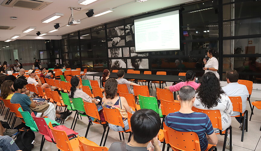 Para apresentar como os estudantes do curso podem já atuar em comunidade, também participou da palestra a presidente do Centro Acadêmico do Design, Maria Clara Arruda. “Com o Centro Acadêmico a gente aprende a sair da nossa zona de conforto, a manejar pessoas, a gerir projetos. É um crescimento. Você pode ficar na sala de aula o quanto você quiser, mas você aprende bastante com a prática”, apontou.