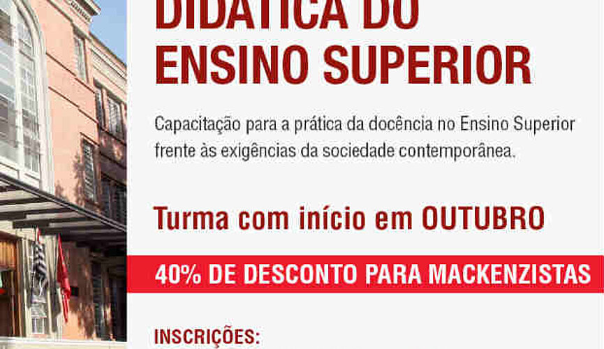 As inscrições para o curso de extensão Didática no Ensino Superior estão abertas até o dia 28 de setembro. As aulas acontecerão toda quinta-feira entre os dias 5 de outubro a 7 de dezembro e têm como objetivo refletir sobre os desafios da prática docente no ensino superior frente às exigências da sociedade contemporânea.