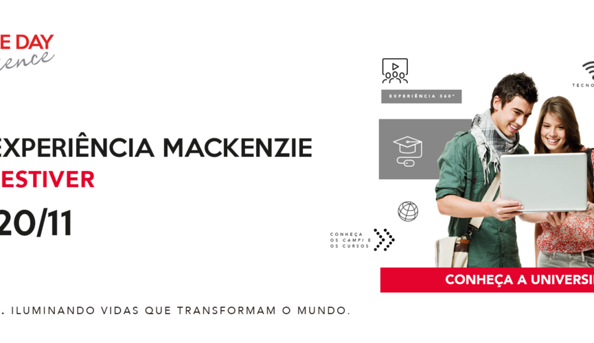Diferentemente das outras edições, neste ano o evento proporcionará uma experiência inovadora aos jovens, por meio de uma plataforma on-line na qual os futuros universitários terão a oportunidade de participar de atividades e lives em diferentes cursos que abrangem as mais variadas áreas. Para saber mais, acesse https://www.mackenziedayexperience.com.br, cadastre-se e viva essa experiência.