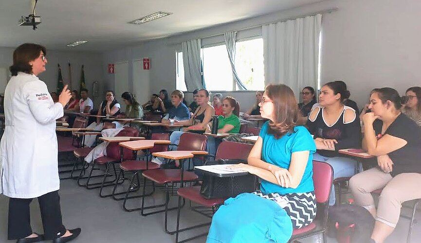 O conteúdo foi ministrado pela equipe multiprofissional do hospital com a parceria da pediatra Wilma Lilia de Castro. Participaram residentes da pediatria do primeiro, segundo e terceiro ano de residência, colaboradores de enfermagem e fisioterapia e a gerente de enfermagem do Materno Infantil, Caroline Baltazar Carsten dos Santos.
