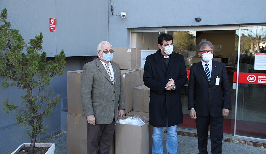 Hospital Universitário Evangélico Mackenzie (HUEM) recebeu a doação de 20 mil máscaras de proteção da Associação Evangelizar É Preciso. O padre Reginaldo Manzotti realizou a entrega da doação para o diretor-geral do hospital, Dr. Rogério Kampa, e para o diretor administrativo, Wilson Costa.