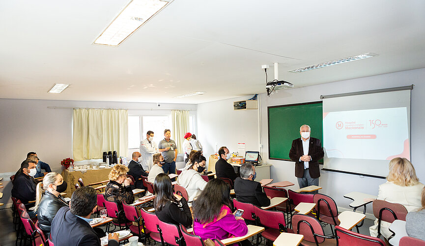 A apresentação destacou a situação em que se encontrava o Hospital antes da posse do Instituto Presbiteriano Mackenzie (IPM), com estrutura física deteriorada, riscos jurídicos, saúde financeira comprometida, gestão inadequada e a confessionalidade abandonada.