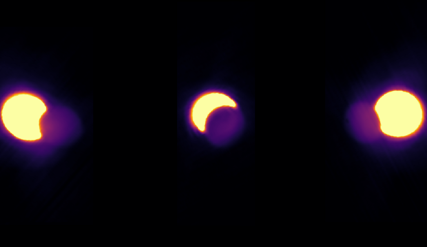 Com todo esse aparato, foi registrada a passagem da Lua em frente ao Sol, como mostra a sequência de imagens no comprimento de onda de 1,4 mm (frequência 212 GHz). Neste comprimento de onda, o Sol é apenas 10 vezes mais brilhante que a Lua e isso permite observar os dois juntos: o círculo amarelo é o Sol, o fraco círculo azul, a Lua. Imagens na faixa visível do espectro não conseguem captar ambos os astros porque o Astro Rei é 10 bilhões de vezes mais brilhante que a Lua. Assim, a Lua sempre aparece como um disco preto que oculta o Sol.